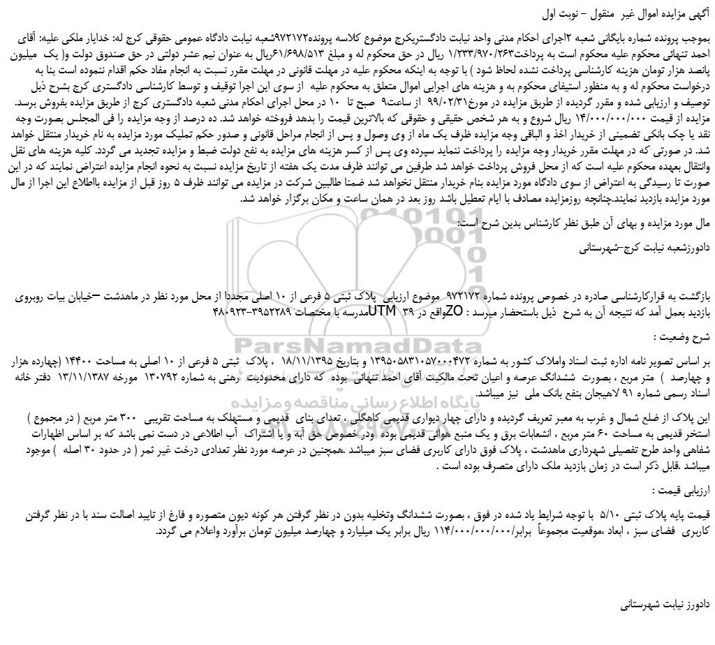 بموجب پرونده شماره بایگانی شعبه 2اجرای احکام مدنی واحد نیابت دادگستریکرج موضوع کلاسه پرونده972172شعبه نیابت دادگاه عمومی حقوقی کرج له: خدایار ملکی علیه: آقای احمد تنهائی محکوم علیه محکوم است به پرداخت1/233/970/263 ریال در حق محکوم له و مبلغ 61/698/513ریال به عنوان نیم عشر دولتی در حق صندوق دولت و( یک میلیون پانصد هزار تومان هزینه کارشناسی پرداخت نشده لحاظ شود ) با توجه به اینکه محکوم علیه در مهلت قانونی در مهلت مقرر نسبت به انجام مفاد حکم اقدام ننموده است بنا به درخواست محکوم له و به منظور استیفای محکوم به و هزینه های اجرایی اموال متعلق به محکوم علیه از سوی این اجرا توقیف و توسط کارشناسی دادگستری کرج بشرح ذیل توصیف و ارزیابی شده و مقرر گردیده از طریق مزایده در مورخ99/02/31 از ساعت9 صبح تا 10 در محل اجرای احکام مدنی شعبه دادگستری کرج از طریق مزایده بفروش برسد. مزایده از قیمت 14/000/000/000 ریال شروع و به هر شخص حقیقی و حقوقی که بالاترین قیمت را بدهد فروخته خواهد شد. ده درصد از وجه مزایده را فی المجلس بصورت وجه نقد یا چک بانکی تضمینی از خریدار اخذ و الباقی وجه مزایده ظرف یک ماه از وی وصول و پس از انجام مراحل قانونی و صدور حکم تملیک مورد مزایده به نام خریدار منتقل خواهد شد. در صورتی که در مهلت مقرر خریدار وجه مزایده را پرداخت ننماید سپرده وی پس از کسر هزینه های مزایده به نفع دولت ضبط و مزایده تجدید می گردد. کلیه هزینه های نقل وانتقال بعهده محکوم علیه است که از محل فروش پرداخت خواهد شد طرفین می توانند ظرف مدت یک هفته از تاریخ مزایده نسبت به نحوه انجام مزایده اعتراض نمایند که در این صورت تا رسیدگی به اعتراض از سوی دادگاه مورد مزایده بنام خریدار منتقل نخواهد شد ضمنا طالبین شرکت در مزایده می توانند ظرف 5 روز قبل از مزایده بااطلاع این اجرا از مال مورد مزایده بازدید نمایند.چنانچه روزمزایده مصادف با ایام تعطیل باشد روز بعد در همان ساعت و مکان برگزار خواهد شد.