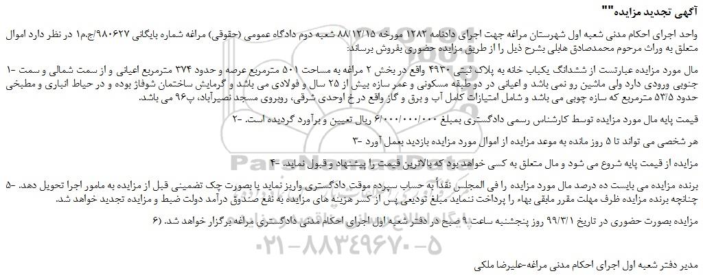 واحد اجرای احکام مدنی شعبه اول شهرستان مراغه جهت اجرای دادنامه 1282 مورخه 88/12/15 شعبه دوم دادگاه عمومی (حقوقی) مراغه شماره بایگانی 980627/ج.م1 در نظر دارد اموال متعلق به وراث مرحوم محمدصادق هابلی بشرح ذیل را از طریق مزایده حضوری بفروش برساند: