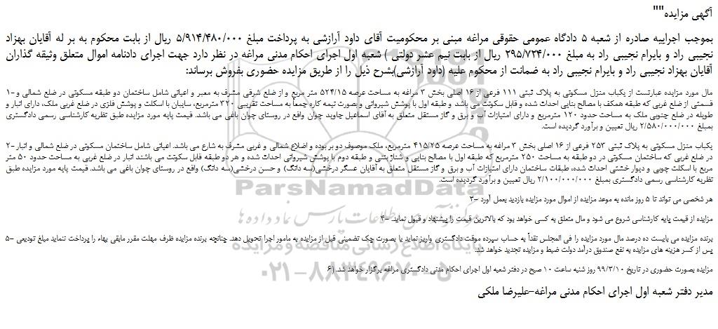 بموجب اجراییه صادره از شعبه 5 دادگاه عمومی حقوقی مراغه مبنی بر محکومیت آقای داود آرازشی به پرداخت مبلغ 5/914/480/000 ریال از بابت محکوم به بر له آقایان بهزاد نجیبی راد و بایرام نجیبی راد به مبلغ 295/724/000 ریال از بابت نیم عشر دولتی ) شعبه اول اجرای احکام مدنی مراغه در نظر دارد جهت اجرای دادنامه اموال متعلق وثیقه گذاران آقایان بهزاد نجیبی راد و بایرام نجیبی راد به ضمانت از محکوم علیه (داود آرازشی)بشرح ذیل را از طریق مزایده حضوری بفروش برساند: