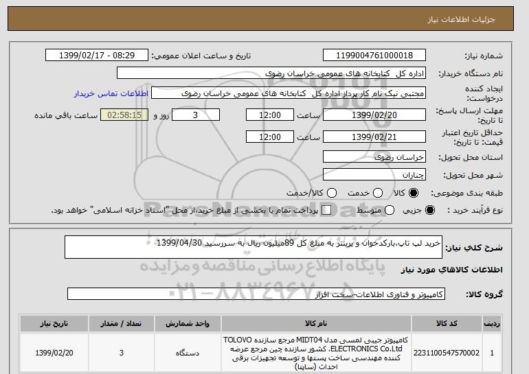 شرح کلی نیاز: خرید لپ تاپ،بارکدخوان و پرینتر به مبلغ کل 89میلیون ریال به سررسید 1399/04/30