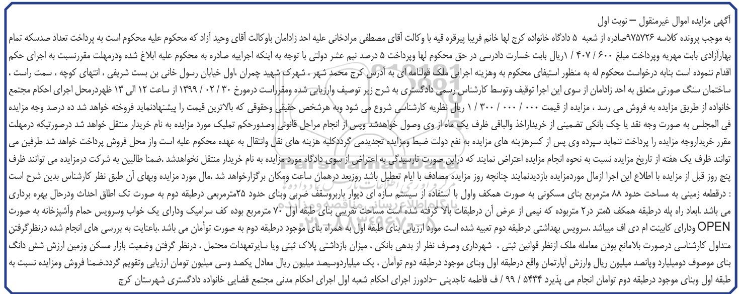 مزایده قطعه زمینی مساحت 88 مترمربع نوبت اول کلاسه 975726
