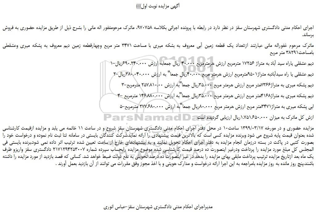 اجرای احکام مدنی دادگستری شهرستان سقز در نظر دارد در رابطه با پرونده اجرائی بکلاسه 970758، ماترک مرحومغفور اله مانی را بشرح ذیل از طریق مزایده حضوری به فروش برساند.
