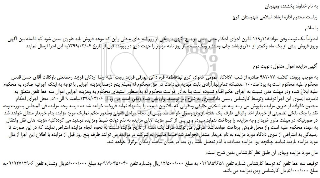 به موجب پرونده کلاسه 982077 صادره از شعبه 7دادگاه عمومی خانواده کرج لها:فاطمه قره داغی ایورقی فرزند رجب علیه رضا اردکان فرزند رحمانعلی باوکالت آقای حسن قدس محکوم علیه محکوم است به پرداخت100 عددسکه تمام بهارآزادی بابت مهریه وپرداخت در حق محکوم له ومبلغ پنج درصدازهزینه اجرایی با توجه به اینکه اجرائیه صادره به محکوم علیه ابلاغ شده ودر مهلت مقرر نسبت به اجرای حکم اقدام ننموده است بنا به در خواست محکوم له به منظور استیفای محکوم به وهزینه اجرایی اموال سه خط تلفن متعلق به نامبرده ازسوی این اجرا توقیف وتوسط کارشناس رسمی دادگستری به شرح زیر توصیف وارزیابی شده ومقرر است در روز از 1399/03/06ساعت 9 الی10در محل اجرای احکام مجتمع خانواده از طریق مزایده بفروش می رسد وبه هر شخص حقیقی وحقوقی که بالاترین قیمت را پیشنهاد نماید فروخته خواهد شد ده درصد وجه مزایده فی المجلس بصورت وجه نقد یا چک بانکی تضمینی از خریدار اخذ والباقی ظرف یک هفته از وی وصول خواهد شد وپس از انجام مراحل قانونی وصدور حکم تملیک مورد مزایده بنام خریدار منتقل خواهد شد در صورتیکه در مهلت مقرر خریدار وجه مزایده را پرداخت ننماید سپرده وی پس از کسر هزینه های مزایده به نفع دولت ضبط ومزایده تجدید می گرددکلیه هزینه های نقل وانتقال به عهده محکوم علیه است واز محل فروش پرداخت خواهد شد .طرفین می توانند ظرف یک هفته از تاریخ مزایده نسبت به نحوه انجام مزایده اعتراض نمایند که در این صورت تا رسیدگی به اعتراض از سوی دادگاه مورد مزایده به نام خریدار منتقل نخواهد شد ضمنا طالبین به شرکت در مزایده می توانند ظرف پنج روز قبل از مزایده با اطلاع این اجرا از مال مورد مزایده بازدید نمایند چنانچه روز مزایده مصادف با ایام تعطیل باشد روز بعد در همان ساعت ومکان برگزار خواهد شد.