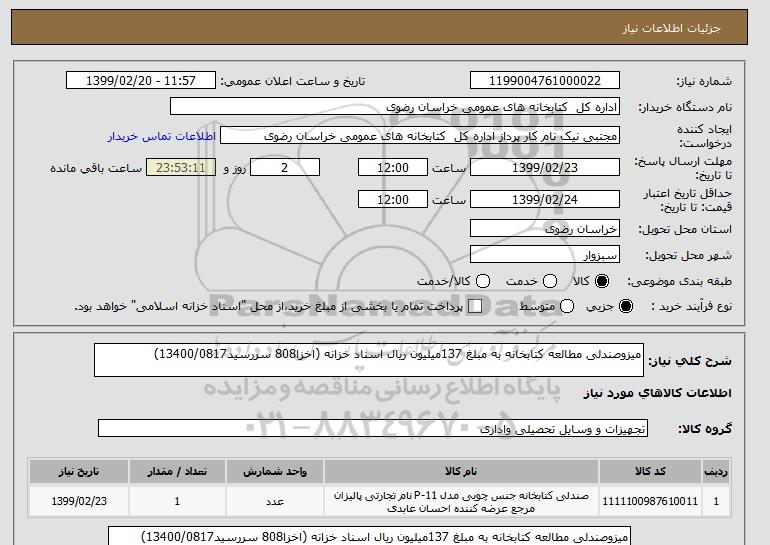 شرح کلی نیاز: میزوصندلی مطالعه کتابخانه به مبلغ 137میلیون ریال اسناد خزانه (اخزا808 سررسید13400/0817)