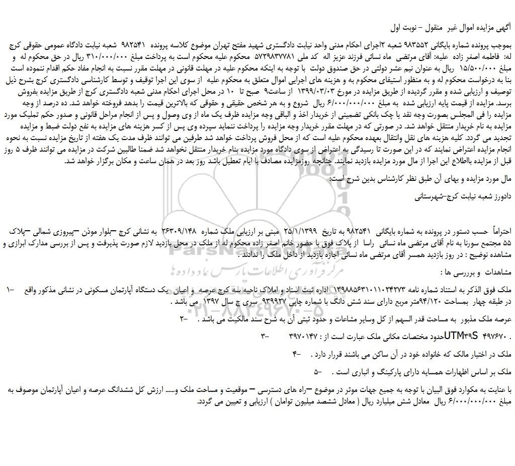 بموجب پرونده شماره بایگانی 983552 شعبه 2اجرای احکام مدنی واحد نیابت دادگستری شهید مفتح تهران موضوع کلاسه پرونده 982541 شعبه نیابت دادگاه عمومی حقوقی کرج له: فاطمه اصغر زاده علیه: آقای مرتضی ماه نسائی فرزند عزیز اله کد ملی 5729837781 محکوم علیه محکوم است به پرداخت مبلغ 310/000/000 ریال در حق محکوم له و مبلغ 15/500/000 ریال به عنوان نیم عشر دولتی در حق صندوق دولت با توجه به اینکه محکوم علیه در مهلت قانونی در مهلت مقرر نسبت به انجام مفاد حکم اقدام ننموده است بنا به درخواست محکوم له و به منظور استیفای محکوم به و هزینه های اجرایی اموال متعلق به محکوم علیه از سوی این اجرا توقیف و توسط کارشناسی دادگستری کرج بشرح ذیل توصیف و ارزیابی شده و مقرر گردیده از طریق مزایده در مورخ 1399/03/03 از ساعت9 صبح تا 10 در محل اجرای احکام مدنی شعبه دادگستری کرج از طریق مزایده بفروش برسد. مزایده از قیمت پایه ارزیابی شده به مبلغ 6/000/000/000 ریال شروع و به هر شخص حقیقی و حقوقی که بالاترین قیمت را بدهد فروخته خواهد شد. ده درصد از وجه مزایده را فی المجلس بصورت وجه نقد یا چک بانکی تضمینی از خریدار اخذ و الباقی وجه مزایده ظرف یک ماه از وی وصول و پس از انجام مراحل قانونی و صدور حکم تملیک مورد مزایده به نام خریدار منتقل خواهد شد. در صورتی که در مهلت مقرر خریدار وجه مزایده را پرداخت ننماید سپرده وی پس از کسر هزینه های مزایده به نفع دولت ضبط و مزایده تجدید می گردد. کلیه هزینه های نقل وانتقال بعهده محکوم علیه است که از محل فروش پرداخت خواهد شد طرفین می توانند ظرف مدت یک هفته از تاریخ مزایده نسبت به نحوه انجام مزایده اعتراض نمایند که در این صورت تا رسیدگی به اعتراض از سوی دادگاه مورد مزایده بنام خریدار منتقل نخواهد شد ضمنا طالبین شرکت در مزایده می توانند ظرف 5 روز قبل از مزایده بااطلاع این اجرا از مال مورد مزایده بازدید نمایند. چنانچه روزمزایده مصادف با ایام تعطیل باشد روز بعد در همان ساعت و مکان برگزار خواهد شد.