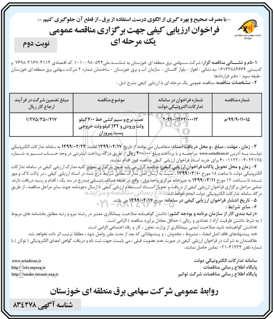 فراخوان ارزیابی کیفی نصب برج و سیم کشی خط 400 کیلو ولت ... نوبت دوم از کلیه افراد متخصص و شرکتها واجد شرایط دعوت به عمل میآید در مناقصه با کد خبرگزاری پارس نماد: 2386268 شرکت نمایند.