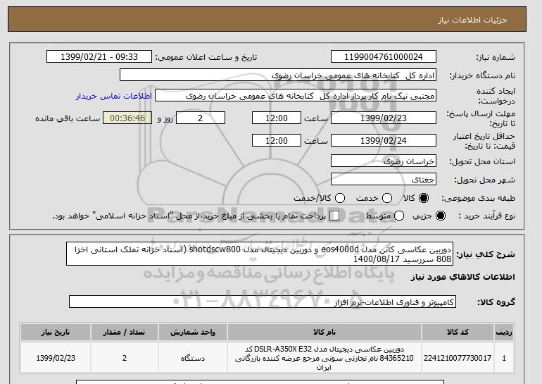 توضیحات خریداردوربین عکاسی کانن مدل eos4000d و دوربین دیجیتال مدل shotdscw800 (اسناد خزانه تملک استانی اخزا 808 سررسید 1400/08/17قیمت براساس اسنادخزانه و قیمت نقد ثبت نشود.