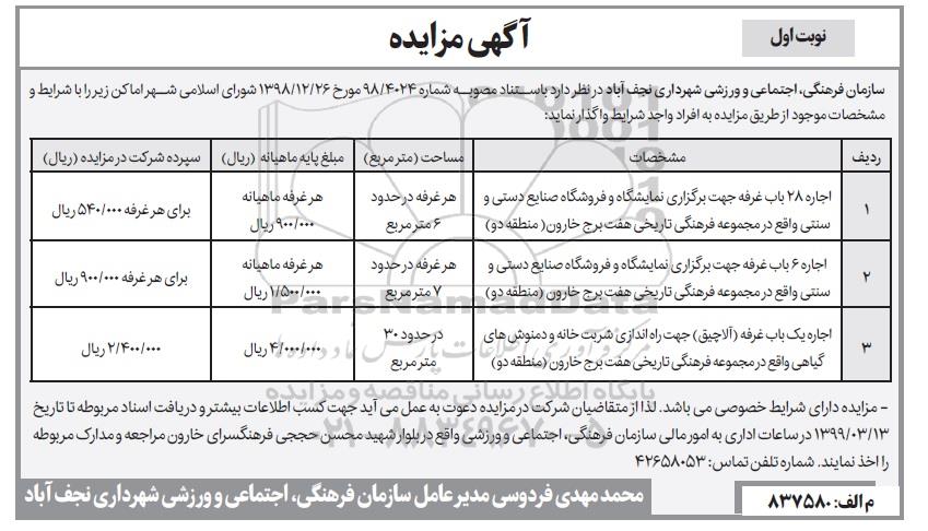 سازمان فرهنگی اجتماعی و ورزشی شهرداری نجف آباد در نظر دارد باستناد مصوبه شماره 4024/98 مورخ 26/12/98 شورای اسلامی شهر اماکن زیر را با شرایط و مشخصات موجود از طریق مزایده به افراد واجد شرایط واگذار نماید