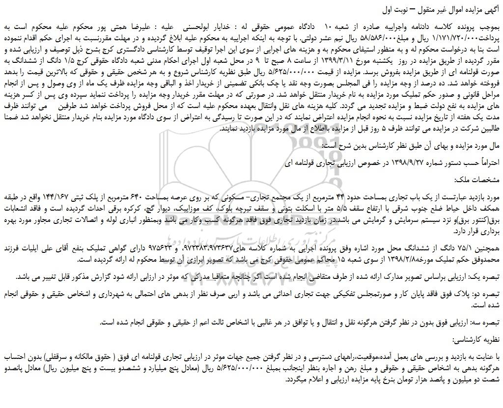 بموجب پرونده کلاسه دادنامه واجراییه صادره از شعبه 10 دادگاه عمومی حقوقی له : خدایار ابولحسنی علیه : علیرضا همتی پور محکوم علیه محکوم است به پرداخت1/171/720/000 ریال و مبلغ58/586/000 ریال نیم عشر دولتی. با توجه به اینکه اجراییه به محکوم علیه ابلاغ گردیده و در مهلت مقررنسبت به اجرای حکم اقدام ننموده است بنا به درخواست محکوم له و به منظور استیفای محکوم به و هزینه های اجرایی از سوی این اجرا توقیف توسط کارشناسی دادگستری کرج بشرح ذیل توصیف و ارزیابی شده و مقرر گردیده از طریق مزایده در روز یکشنبه مورخ 1399/3/11 از ساعت 8 صبح تا 9 در محل شعبه اول اجرای احکام مدنی شعبه دادگاه حقوقی کرج 1/5 دانگ از ششدانگ به صورت قولنامه ای از طریق مزایده بفروش برسد. مزایده از قیمت 5/625/000/000 ریال طبق نظریه کارشناس شروع و به هر شخص حقیقی و حقوقی که بالاترین قیمت را بدهد فروخته خواهد شد. ده درصد از وجه مزایده را فی المجلس بصورت وجه نقد یا چک بانکی تضمینی از خریدار اخذ و الباقی وجه مزایده ظرف یک ماه از وی وصول و پس از انجام مراحل قانونی و صدور حکم تملیک مورد مزایده به نام خریدار منتقل خواهد شد. در صورتی که در مهلت مقرر خریدار وجه مزایده را پرداخت ننماید سپرده وی پس از کسر هزینه های مزایده به نفع دولت ضبط و مزایده تجدید می گردد. کلیه هزینه های نقل وانتقال بعهده محکوم علیه است که از محل فروش پرداخت خواهد شد طرفین می توانند ظرف مدت یک هفته از تاریخ مزایده نسبت به نحوه انجام مزایده اعتراض نمایند که در این صورت تا رسیدگی به اعتراض از سوی دادگاه مورد مزایده بنام خریدار منتقل نخواهد شد ضمنا طالبین شرکت در مزایده می توانند ظرف 5 روز قبل از مزایده بااطلاع از مال مورد مزایده بازدید نمایند.