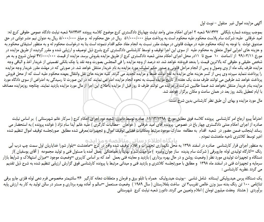 بموجب پرونده شماره بایگانی 981432 شعبه 2 اجرای احکام مدنی واحد نیابت چهارباغ دادگستری کرج موضوع کلاسه پرونده 982483 شعبه نیابت دادگاه عمومی حقوقی کرج له: امید خرقانی علیه: شرکت سام پلاست محکوم علیه محکوم است به پرداخت مبلغ 51/000/000 ریال در حق محکوم له و مبلغ 5/000/000 ریال به عنوان نیم عشر دولتی در حق صندوق دولت با توجه به اینکه محکوم علیه در مهلت قانونی در مهلت مقرر نسبت به انجام مفاد حکم اقدام ننموده است بنا به درخواست محکوم له و به منظور استیفای محکوم به و هزینه های اجرایی اموال متعلق به محکوم علیه از سوی این اجرا توقیف و توسط کارشناسی دادگستری کرج بشرح ذیل توصیف و ارزیابی شده و مقرر گردیده از طریق مزایده در مورخ 99/03/11 از //ساعت 10 صبح تا 11در محل اجرای احکام مدنی شعبه دادگستری کرج از طریق مزایده بفروش برسد. مزایده از قیمت 47/000/000 تومان شروع و به هر شخص حقیقی و حقوقی که بالاترین قیمت را بدهد فروخته خواهد شد. ده درصد از وجه مزایده را فی المجلس بصورت وجه نقد یا چک بانکی تضمینی از خریدار اخذ و الباقی وجه مزایده ظرف یک ماه از وی وصول و پس از انجام مراحل قانونی و صدور حکم تملیک مورد مزایده به نام خریدار منتقل خواهد شد. در صورتی که در مهلت مقرر خریدار وجه مزایده را پرداخت ننماید سپرده وی پس از کسر هزینه های مزایده به نفع دولت ضبط و مزایده تجدید می گردد. کلیه هزینه های نقل وانتقال بعهده محکوم علیه است که از محل فروش پرداخت خواهد شد طرفین می توانند ظرف مدت یک هفته از تاریخ مزایده نسبت به نحوه انجام مزایده اعتراض نمایند که در این صورت تا رسیدگی به اعتراض از سوی دادگاه مورد مزایده بنام خریدار منتقل نخواهد شد ضمنا طالبین شرکت در مزایده می توانند ظرف 5 روز قبل از مزایده بااطلاع این اجرا از مال مورد مزایده بازدید نمایند. چنانچه روزمزایده مصادف با ایام تعطیل باشد روز بعد در همان ساعت و مکان برگزار خواهد شد.