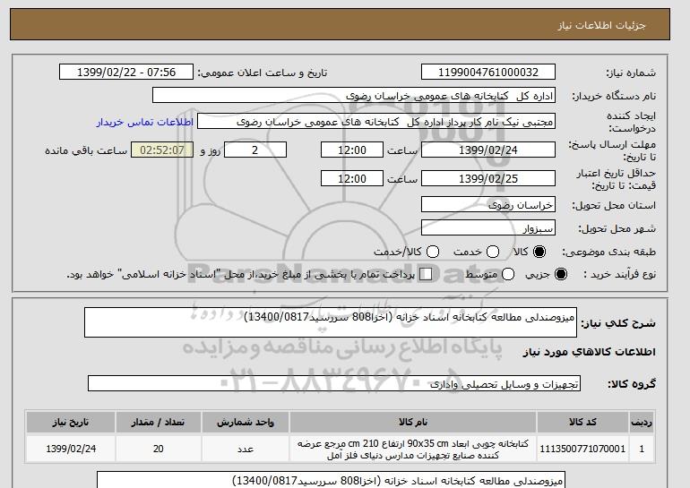 شرح کلی نیاز: میزوصندلی مطالعه کتابخانه اسناد خزانه (اخزا808 سررسید13400/0817)