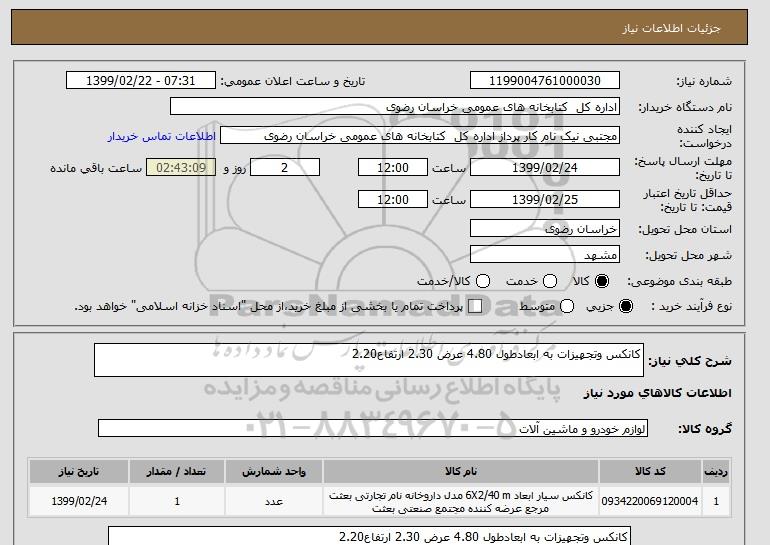 شرح کلی نیاز: کانکس وتجهیزات به ابعادطول 4.80 عرض 2.30 ارتفاع2.20