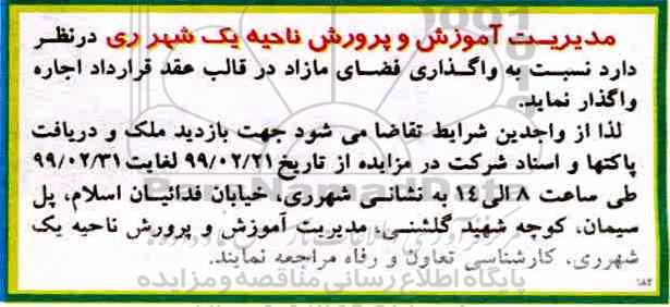 مدیریت آموزش و پرورش ناحیه یک شهر ری در نظر دارد نسبت به واگذاری فضای مازاد در قالب عقد قراداد اجاره واگذار نماید.