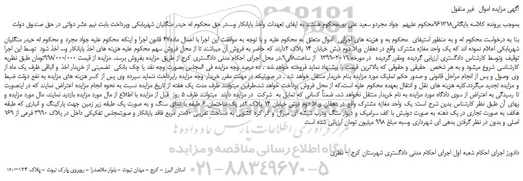 بنا به درخواست محکوم له و به منظور استیفای  محکوم به و هزینه های اجرایی  اموال متعلق به محکوم علیه و با توجه به موافقت این اجرا با اعمال ماده47 قانون اجرا و اینکه محکوم علیه جواد مجرد و محکوم له حیدر منگلیان شهربابکی اعلام نموده اند که یک واحد مغازه مشترک واقع در دهقان ویلا دوم نبش خیابان 14 پلاک 2دارند که حاضر به فروش آن میباشند تا از محل فروش سهم محکوم علیه هزینه های اخذ پایانکار و... اخذ شود  توسط این اجرا توقیف وتوسط کارشناس دادگستری ارزیابی گردیده ومقرر گردیده  در مورخه 19-3-1399  از ساعت.8الی9.در محل اجرای احکام مدنی دادگستری کرج از طریق مزایده بفروش برسد. مزایده از قیمت 998/000/000تومان طبق نظریه کارشناسی شروع میشود و به هر شخص  حقیقی و حقوقی که بالاترین قیمت را پیشنهاد نماید فروخته خواهد شد . ده درصد وجه مزایده فی المجلس بصورت وجه نقد یا چک بانکی  تضمینی از خریدار اخذ و الباقی ظرف یک ماه از وی وصول و پس از انجام مراحل قانونی و صدور حکم تملیک مورد مزایده بنام خریدار منتقل خواهد شد . در صورتیکه در مهلت مقرر خریدار وجه مزایده راپرداخت ننماید سپرده وی پس از کسر هزینه های مزایده به نفع دولت ضبط و مزایده تجدید میگردد.کلیه هزینه های نقل و انتقال بعهده محکوم علیه است.که از محل فروش پرداخت خواهد شد.طرفین میتوانند ظرف مدت یک هفته از تاریخ مزایده نسبت به نحوه انجام مزایده اعتراض نمایند که در اینصورت تا رسیدگی به اعتراض از سوی دادگاه مورد مزایده به نام خریدار منتقل نخواهد شد. ضمناً کسانی که تمایل به  شرکت  در مزایده دارند  میتوانند ظرف 5 روز  قبل از مزایده با اطلاع از مال مورد مزایده بازدید نمایند. مال مورد مزایده و بهای آن طبق نظر کارشناس بدین شرح است: یک واحد مغازه مشترک واقع در دهقان ویلا دوم نبش خیابان 14 پلاک 2در یک ساختمان 6 طبقه با نمای سنگ و به صورت یک طبقه زیر زمین جهت پارکینگ و انباری که طبقه هکف به صورت تجاری در یک دهنه به صورت دونبش با کف سرامیک و دیوار سنگ ودرب شیشه ای میرال و کر کره کشویی به مساحت تقریبی 50متر مربع فاقد پایانکار و صورتمجلس تفکیکی داخل در پلاک 3990 فرعی از 169 اصلی و بدون در نظر گرفتن بدهی ای شهرداری و...به مبلغ 998 میلیون تومان ارزیابی شده است