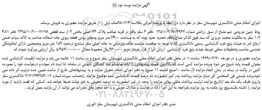 اجرای احکام مدنی دادگستری شهرستان سقز در نظر دارد در رابطه با پرونده اجرائی بکلاسه 980714ملک ذیل را از طریق مزایده حضوری به فروش برساند.
