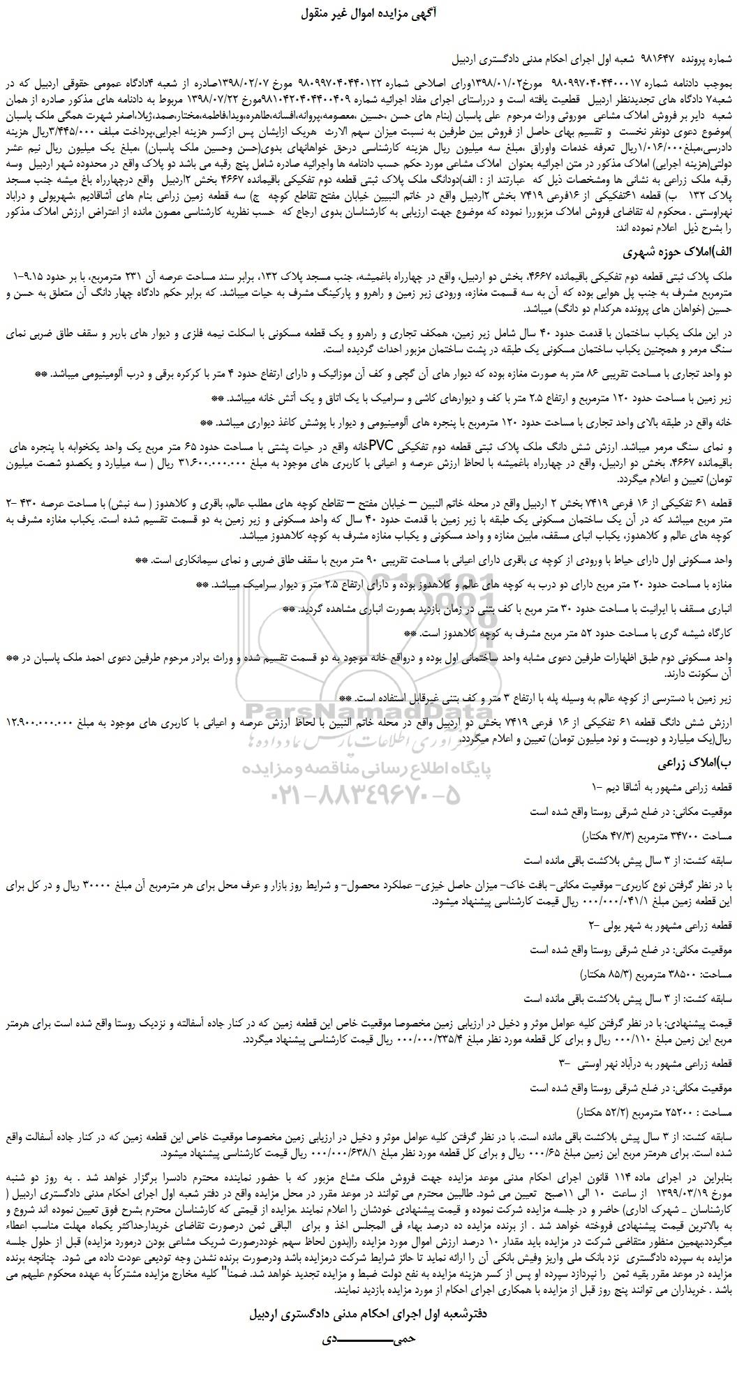 بموجب دادنامه شماره 9809970404400017 مورخ1398/01/02ورای اصلاحی شماره 980997040440122 مورخ 1398/02/07صادره از شعبه 4دادگاه عمومی حقوقی اردبیل که در شعبه7 دادگاه های تجدیدنظر اردبیل قطعیت یافته است و درراستای اجرای مفاد اجرائیه شماره 9810420404400409مورخ 1398/07/22 مربوط به دادنامه های مذکور صادره از همان شعبه دایر بر فروش املاک مشاعی موروثی وراث مرحوم علی پاسبان (بنام های حسن ،حسین ،معصومه،پروانه،افسانه،طاهره،ویدا،فاطمه،مختار،صمد،ژیلا،اصغر شهرت همگی ملک پاسبان )موضوع دعوی دونفر نخست و تقسیم بهای حاصل از فروش بین طرفین به نسبت میزان سهم الارث هریک ازایشان پس ازکسر هزینه اجرایی،پرداخت مبلف 3/445/000ریال هزینه دادرسی،مبلغ1/016/000ریال تعرفه خدمات واوراق ،مبلغ سه میلیون ریال هزینه کارشناسی درحق خواهانهای بدوی(حسن وحسین ملک پاسبان) ،مبلغ یک میلیون ریال نیم عشر دولتی(هزینه اجرایی) املاک مذکور در متن اجرائیه بعنوان املاک مشاعی مورد حکم حسب دادنامه ها واجرائیه صادره شامل پنج رقبه می باشد دو پلاک واقع در محدوده شهر اردبیل وسه رقبه ملک زراعی به نشانی ها ومشخصات ذیل که عبارتند از : الف)دودانگ ملک پلاک ثبتی قطعه دوم تفکیکی باقیمانده 4667 بخش 2اردبیل واقع درچهارراه باغ میشه جنب مسجد پلاک 132 ب) قطعه 61تفکیکی از 16فرعی 7419 بخش 2اردبیل واقع در خاتم النبیین خیابان مفتح تقاطع کوچه ج) سه قطعه زمین زراعی بنام های آشاقادیم ،شهریولی و دراباد نهراوستی . محکوم له تقاضای فروش املاک مزبوررا نموده که موضوع جهت ارزیابی به کارشناسان بدوی ارجاع که حسب نظریه کارشناسی مصون مانده از اعتراض ارزش املاک مذکور را بشرح ذیل اعلام نموده اند: