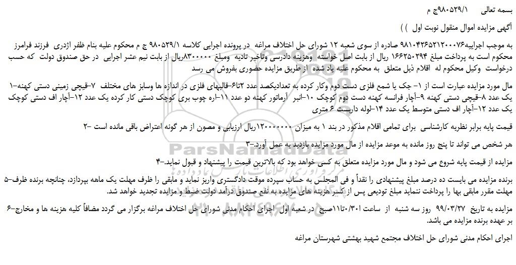 به موجب اجراییه9810426521200076 صادره از سوی شعبه 12 شورای حل اختلاف مراغه  در پرونده اجرایی کلاسه 980529/1 ج م محکوم علیه بنام ظفر اژدری  فرزند فرامرز  محکوم است به پرداخت مبلغ 166250294 ریال از بابت اصل خواسته  وهزینه دادرسی وتاخیر تادیه  ومبلغ 8300000ریال از بابت نیم عشر اجرایی  در حق صندوق دولت  که حسب درخواست  وکیل محکوم له  اقلام ذیل متعلق  به محکوم علیه یاد شده  از طریق مزایده حضوری بفروش می رسد