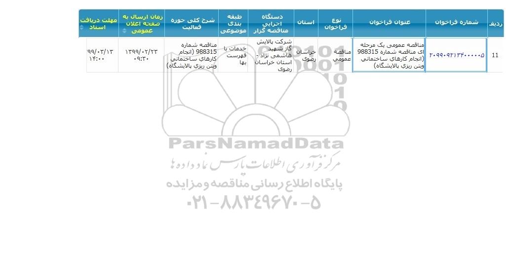 عنوان فراخوان : مناقصه عمومی یک مرحله ای شماره 988315 انجام کارهای ساختمانی و بتن ریزی پالایشگاه