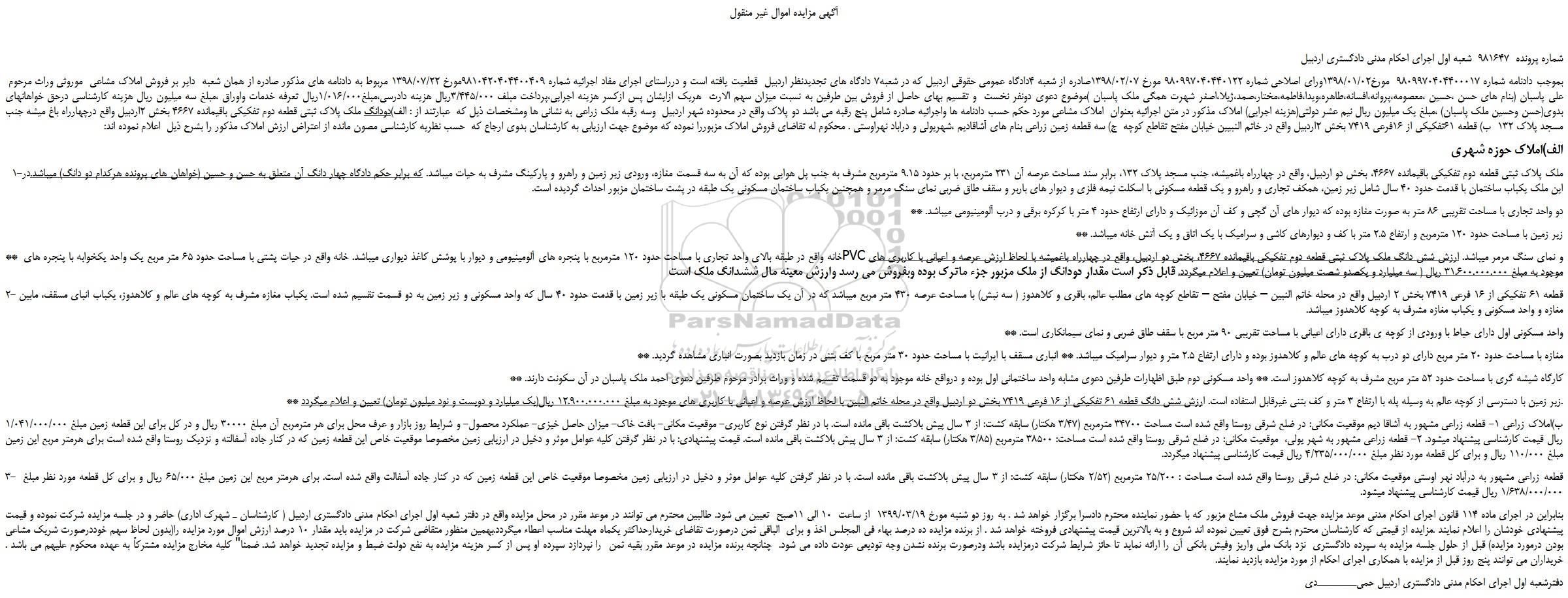 بموجب دادنامه شماره 9809970404400017 مورخ1398/01/02ورای اصلاحی شماره 980997040440122 مورخ 1398/02/07صادره از شعبه 4دادگاه عمومی حقوقی اردبیل که در شعبه7 دادگاه های تجدیدنظر اردبیل قطعیت یافته است و درراستای اجرای مفاد اجرائیه شماره 9810420404400409مورخ 1398/07/22 مربوط به دادنامه های مذکور صادره از همان شعبه دایر بر فروش املاک مشاعی موروثی وراث مرحوم علی پاسبان (بنام های حسن ،حسین ،معصومه،پروانه،افسانه،طاهره،ویدا،فاطمه،مختار،صمد،ژیلا،اصغر شهرت همگی ملک پاسبان )موضوع دعوی دونفر نخست و تقسیم بهای حاصل از فروش بین طرفین به نسبت میزان سهم الارث هریک ازایشان پس ازکسر هزینه اجرایی،پرداخت مبلف 3/445/000ریال هزینه دادرسی،مبلغ1/016/000ریال تعرفه خدمات واوراق ،مبلغ سه میلیون ریال هزینه کارشناسی درحق خواهانهای بدوی(حسن وحسین ملک پاسبان) ،مبلغ یک میلیون ریال نیم عشر دولتی(هزینه اجرایی) املاک مذکور در متن اجرائیه بعنوان املاک مشاعی مورد حکم حسب دادنامه ها واجرائیه صادره شامل پنج رقبه می باشد دو پلاک واقع در محدوده شهر اردبیل وسه رقبه ملک زراعی به نشانی ها ومشخصات ذیل که عبارتند از : الف)دودانگ ملک پلاک ثبتی قطعه دوم تفکیکی باقیمانده 4667 بخش 2اردبیل واقع درچهارراه باغ میشه جنب مسجد پلاک 132 ب) قطعه 61تفکیکی از 16فرعی 7419 بخش 2اردبیل واقع در خاتم النبیین خیابان مفتح تقاطع کوچه ج) سه قطعه زمین زراعی بنام های آشاقادیم ،شهریولی و دراباد نهراوستی . محکوم له تقاضای فروش املاک مزبوررا نموده که موضوع جهت ارزیابی به کارشناسان بدوی ارجاع که حسب نظریه کارشناسی مصون مانده از اعتراض ارزش املاک مذکور را بشرح ذیل اعلام نموده اند:
