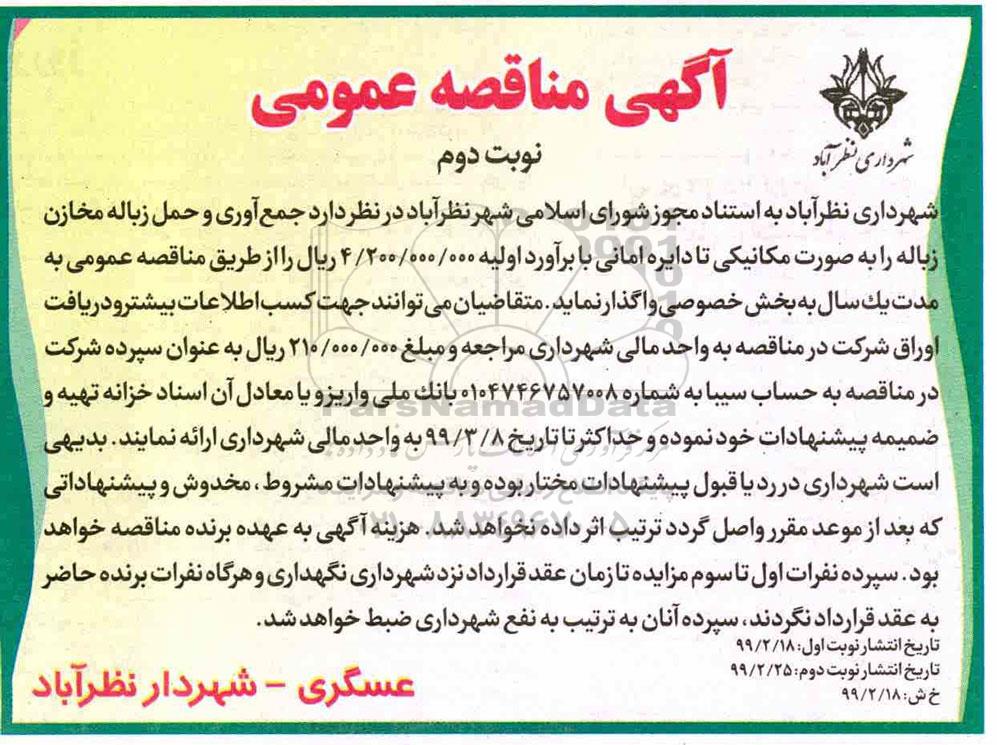 شهرداری نظرآباد به استناد مجوز شورای اسلامی شهر در نظر دارد جمع آوری و حمل زباله مخازن زباله را به صورت مکانیکی تا دایره امانی با برآورد اولیه 4.200.000.000 ریال را از طریق مناقصه عمومی به مدت یکسال به بخش خصوصی واگذار نماید.