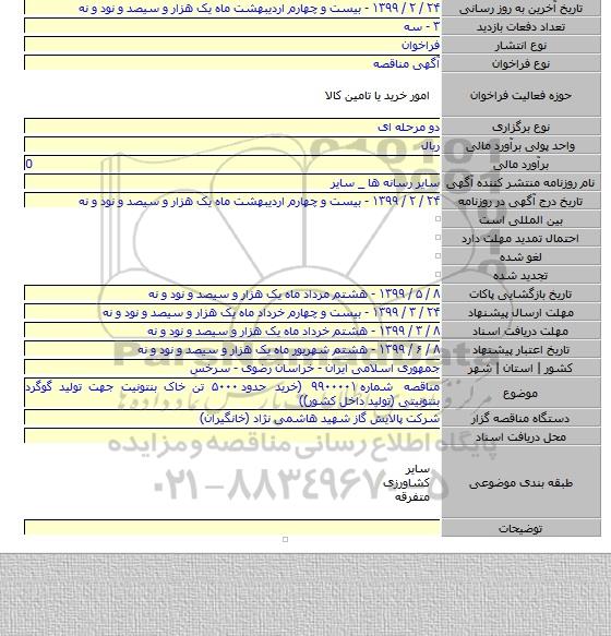 مناقصه, مناقصه شماره ۹۹۰۰۰۰۱ (خرید حدود ۵۰۰۰ تن خاک بنتونیت جهت تولید گوگرد بنتونیتی (تولید داخل کشور)), مناقصه شماره ۹۹۰۰۰۰۱ (خرید حدود ۵۰۰۰ تن خاک بنتونیت جهت تولید گوگرد بنتونیتی (تولید داخل کشور))