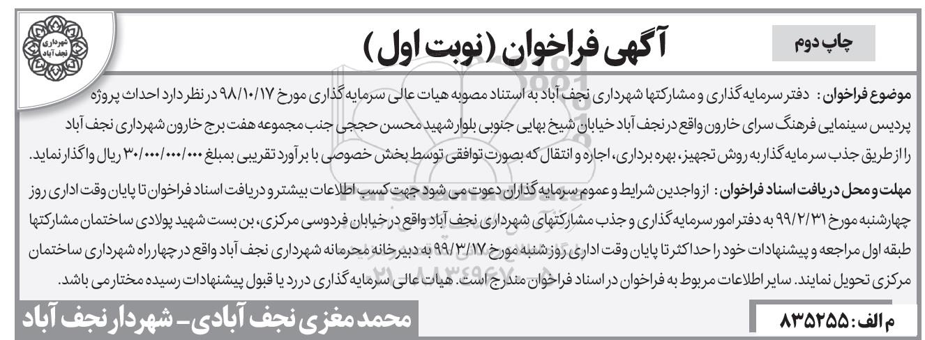 موضوع فراخوان: دفتر سرمایه گذاری و مشارکتهای شهرداری نجف آباد در نظر دارد احداث پروژه پردیس سینمایی فرهنگ سرای خارون واقع در نجف آباد خیابان شیخ بهایی جنوبی بلوار شهید محسن حججی جنب مجموعه هفت برج خارون شهرداری نجف آباد را از طریق جذب سرمایه گذار به روش تجهیز، بهره برداری، اجاره و انتقال که بصورت توافقی توسط بخش خصوصی با برآورد تقریبی به مبلغ 30.000.000.000 ریال واگذار  نماید