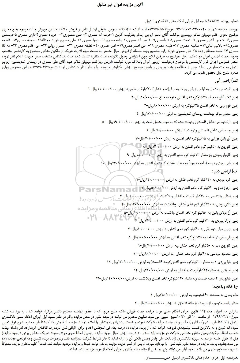 بموجب دادنامه شماره 9709970404400720 مورخ1397/05/07صادره از شعبه 4دادگاه عمومی حقوقی اردبیل دایر بر فروش املاک مشاعی موروثی وراث مرحوم رفیع مصری موضوع دعوی خانم مهربان شاکر رویندزق باوکالت آقای ناصر اروجی اینانلو بطرفیت آقایان 1-عزت اله مصری 2- طلی منصوری3- عزیزه مصری4-نازی مصری 5-دوستعلی مصری6- شمس الدین مصری 7- نعمت مصری8-ثریامصری9- فرض اله مصری10-رقیه مصری11- زهرا مصری 12-علی مصری فرزند حمداله13- سمیه مصری14- فاطمه مصری15- بالابیم نباتی16- سکینه مصری 17-حلیمه مصری 18- علی اصغر مصری19- امیر مصری 20- لطیفه مصری 21- سمزار روابی 22- می خانم مصری 23- مه لقا مصری 24-خصه مصطفی زاده 25-علی مصری فرزند رفیع وتقسیم وجوه حاصله از فروش اموال مشاعی به نسبت سهم الارث هریک از مالکین مشاعی ،موضوع به کارشناس منتخب وبدوی جهت ارزیابی اموال موردحکم ارجاع ،موضوع به طرفین ابلاغ چون اعتراضی وصول نگردیده است ،نظریه تثبیت شده است .کارشناس منتخب بدین صورت اعلام نظر نموده اند:در خصوص اجرای قرار کارشناسی با موضوع درخواست ارزیابی اموال واملاک مورد خواسته (ارزش روز)خانم مهربان شاکر علیه آقای علی مصری در روستای گندیشمین ازتوابع اردبیل به استحضار می رساند ،پس از مطالعه پرونده وبررسی پیرامون موضوع ارزیابی ،گزارش مربوطه برابر اظهارنظر کارشناسی اولیه بتاریخ1397/03/25 در این خصوص ورای صادره بشرح ذیل بحضور تقدیم می گردد: