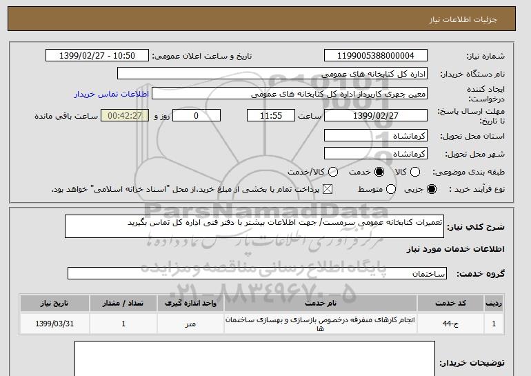 شرح کلی نیاز: تعمیرات کتابخانه عمومی سرمست/ جهت اطلاعات بیشتر با دفتر فنی اداره کل تماس بگیرید