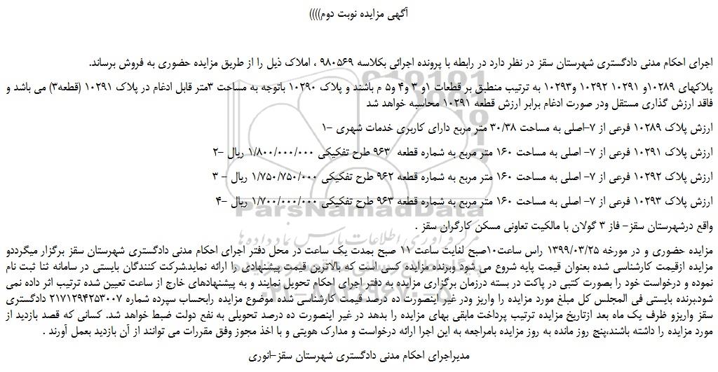 اجرای احکام مدنی دادگستری شهرستان سقز در نظر دارد در رابطه با پرونده اجرائی بکلاسه 980569 ، املاک ذیل را از طریق مزایده حضوری به فروش برساند.