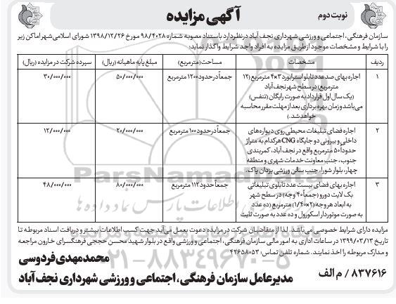| 2 | اجاره فضای تبلیغات محیطی روی دیواره های داخلی و بیرونی دو جایگاه CNG هر کدام به متراژ حدودا 50 مترمربع واقع در نجف آباد کمربندی جنوب جنب معاونت خدمات شهری و منطقه چهار بلوار شورا جنب سالن ورزشی یزدان پاک | جمعا در حدود 100 مترمربع | 20.000.000 | 12.000.000 |