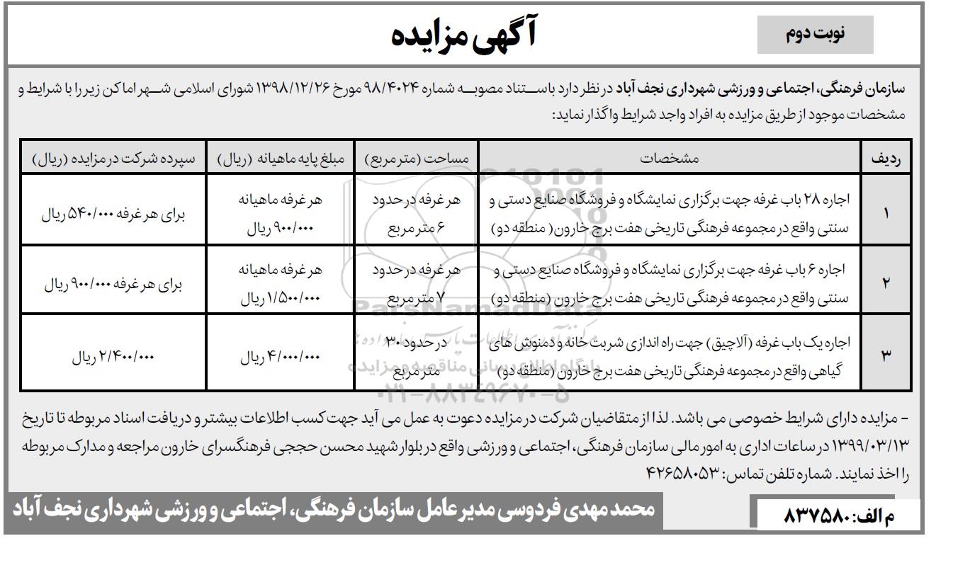سازمان فرهنگی اجتماعی و ورزشی شهرداری نجف آباد در نظر دارد باستناد مصوبه شماره 4024/98 مورخ 26/12/98 شورای اسلامی شهر اماکن زیر را با شرایط و مشخصات موجود از طریق مزایده به افراد واجد شرایط واگذار نماید