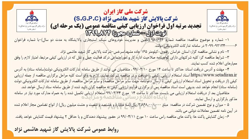 1- شماره و موضوع مناقصه: مناقصه شماره 980634 (تامین و مدیریت خودروهای سبک استیجاری پالایشگاه به مدت دو سال)- با شماره فراخوان 2099092134000006 در سامانه تدارکات الکترونیکی دولت