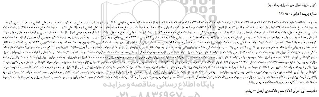 شعبه صادر کننده:شعبه اول اجرای احکام مدنی دادگستری شهرستان اردبیل/قدیم