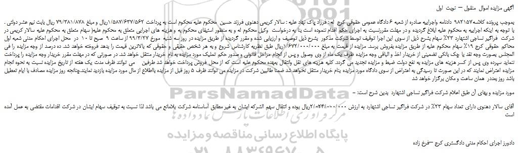 بموجب پرونده کلاسه982157  دادنامه واجراییه صادره از شعبه 6 دادگاه عمومی حقوقی کرج  له : فرزاد پاک نهاد علیه : سالار کریمی دهنوی فرزند حسین  محکوم علیه محکوم است به پرداخت 1/587/637/562ریال و مبلغ 79/381/878 ریال بابت نیم عشر دولتی . با توجه به اینکه اجراییه به محکوم علیه ابلاغ گردیده و در مهلت مقررنسبت به اجرای حکم اقدام ننموده است بنا به درخواست  وکیل محکوم له و به منظور استیفای محکوم به و هزینه های اجرایی متعلق به محکوم علیه( سهام متعلق به محکوم علیه سالار کریمی در شرکت  فراگیر نساجی اشتهارد 23% سهام بشرح ذیل از سوی این اجرا توقیف توسط شرکت مذکور  بشرح ذیل توصیف و ارزیابی شده و مقرر گردیده از طریق مزایده در روز سه شنبه  مورخ 99/3/27 از ساعت 9  صبح تا 10  در  محل اجرای احکام مدنی شعبه اول محاکم حقوقی کرج 19% سهام محکوم علیه از طریق مزایده بفروش برسد. مزایده از قیمت به مبلغ 1/672/000/000ریال طبق نظریه کارشناس شروع و به هر شخص حقیقی و حقوقی که بالاترین قیمت را بدهد فروخته خواهد شد. ده درصد از وجه مزایده را فی المجلس بصورت وجه نقد یا چک بانکی تضمینی از خریدار اخذ و الباقی وجه مزایده ظرف یک ماه از وی وصول و پس از انجام مراحل قانونی و صدور حکم تملیک مورد مزایده به نام خریدار منتقل خواهد شد. در صورتی که در مهلت مقرر خریدار وجه مزایده را پرداخت ننماید سپرده وی پس از کسر هزینه های مزایده به نفع دولت ضبط و مزایده تجدید می گردد. کلیه هزینه های نقل وانتقال بعهده محکوم علیه است که از محل فروش پرداخت خواهد شد طرفین    می توانند ظرف مدت یک هفته از تاریخ مزایده نسبت به نحوه انجام مزایده اعتراض نمایند که در این صورت تا رسیدگی به اعتراض از سوی دادگاه مورد مزایده بنام خریدار منتقل نخواهد شد ضمنا طالبین شرکت در مزایده می توانند ظرف 5 روز قبل از مزایده بااطلاع از مال مورد مزایده بازدید نمایند.چنانجه روز مزایده مصادف با ایام تعطیل باشد روز بعددر  همان ساعت و مکان برگزار خواهد شد