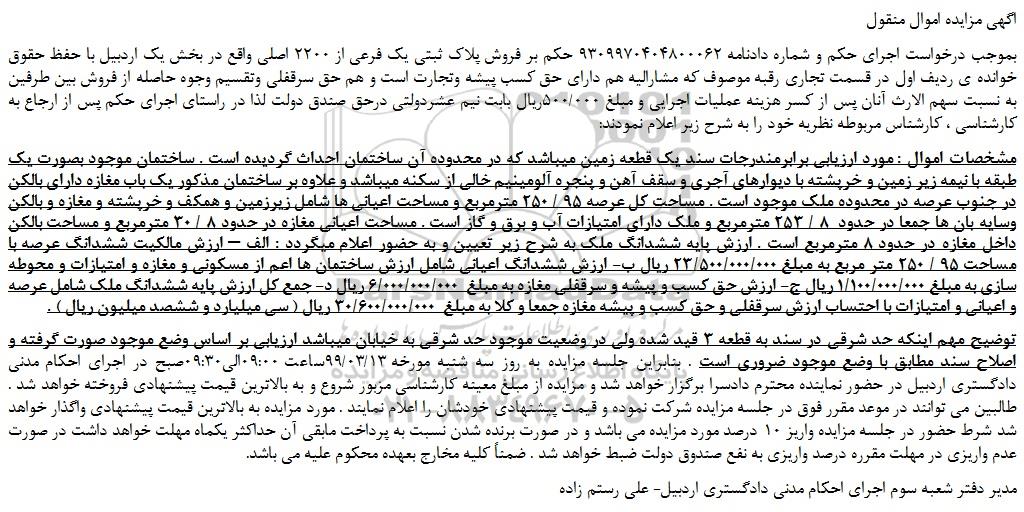 بموجب درخواست اجرای حکم و شماره دادنامه 9309970404800062 حکم بر فروش پلاک ثبتی یک فرعی از 2200 اصلی واقع در بخش یک اردبیل با حفظ حقوق خوانده ی ردیف اول در قسمت تجاری رقبه موصوف که مشارالیه هم دارای حق کسب پیشه وتجارت است و هم حق سرقفلی وتقسیم وجوه حاصله از فروش بین طرفین به نسبت سهم الارث آنان پس از کسر هزینه عملیات اجرایی و مبلغ 500/000ریال بابت نیم عشردولتی درحق صندق دولت لذا در راستای اجرای حکم پس از ارجاع به کارشناسی ، کارشناس مربوطه نظریه خود را به شرح زیر اعلام نمودند: