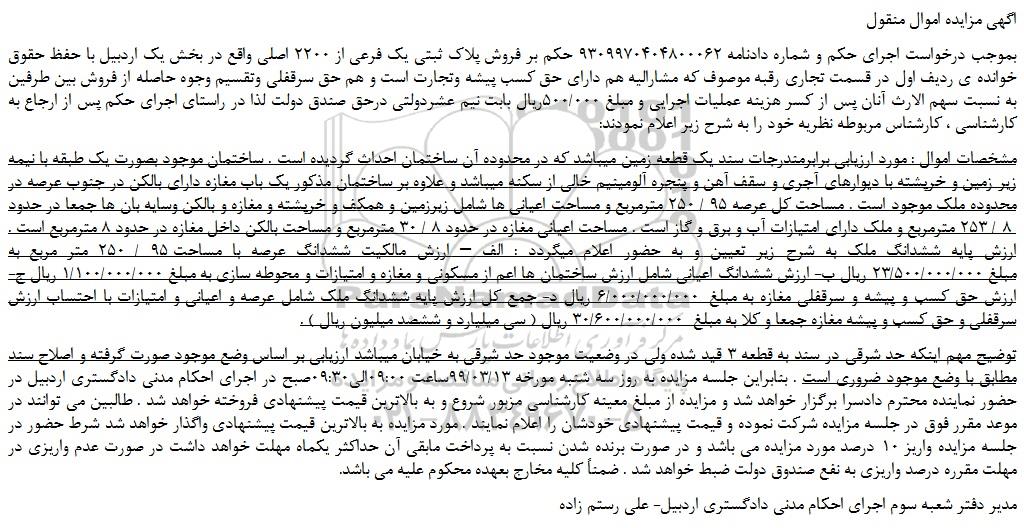 بموجب درخواست اجرای حکم و شماره دادنامه 9309970404800062 حکم بر فروش پلاک ثبتی یک فرعی از 2200 اصلی واقع در بخش یک اردبیل با حفظ حقوق خوانده ی ردیف اول در قسمت تجاری رقبه موصوف که مشارالیه هم دارای حق کسب پیشه وتجارت است و هم حق سرقفلی وتقسیم وجوه حاصله از فروش بین طرفین به نسبت سهم الارث آنان پس از کسر هزینه عملیات اجرایی و مبلغ 500/000ریال بابت نیم عشردولتی درحق صندق دولت لذا در راستای اجرای حکم پس از ارجاع به کارشناسی ، کارشناس مربوطه نظریه خود را به شرح زیر اعلام نمودند: