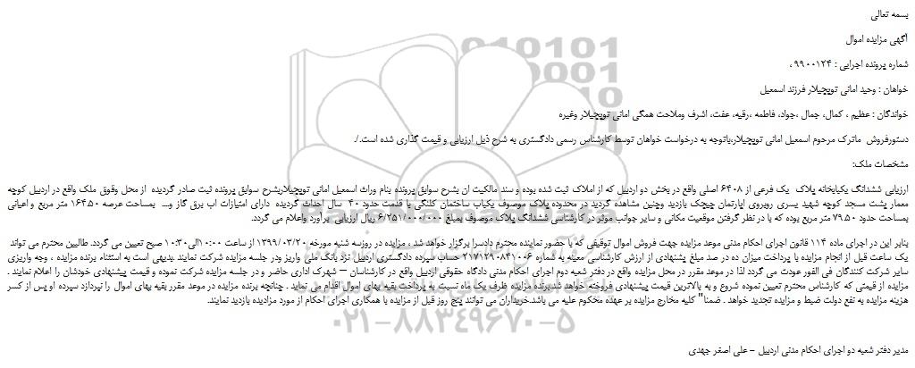 بنابر این در اجرای ماده 114 قانون اجرای احکام مدنی موعد مزایده جهت فروش اموال توقیفی که با حضور نماینده محترم دادسرا برگزار خواهد شد ، مزایده در روزسه شنبه مورخه 1399/03/20 از ساعت 10:00الی10:30 صبح تعیین می گردد. طالبین محترم می تواند یک ساعت قبل از انجام مزایده با پرداخت میزان ده در صد مبلغ پشنهادی از ارزش کارشناسی معینه به شماره 2171290841006 حساب سپرده دادگستری اردبیل نزد بانک ملی واریز ودر جلسه مزایده شرکت نمایند .بدیهی است به استثناء برنده مزایده ، وجه واریزی سایر شرکت کنندگان فی الفور عودت می گردد لذا در موعد مقرر در محل مزایده واقع در دفتر شعبه دوم اجرای احکام مدنی دادگاه حقوقی اردبیل واقع در کارشناسان – شهرک اداری حاضر و در جلسه مزایده شرکت نموده و قیمت پیشنهادی خودشان را اعلام نمایند . مزایده از قیمتی که کارشناس محترم تعیین نموده شروع و به بالاترین قیمت پیشنهادی فروخته خواهد شد.برنده مزایده ظرف یک ماه نسبت به پرداخت بقیه بهای اموال اقدام می نماید . چنانچه برنده مزایده در موعد مقرر بقیه بهای اموال را نپردازد سپرده او پس از کسر هزینه مزایده به نفع دولت ضبط و مزایده تجدید خواهد . ضمنا" کلیه مخارج مزایده بر عهده محکوم علیه می باشد.خریداران می توانند پنج روز قبل از مزایده با همکاری اجرای احکام از مورد مزادیده بازدید نمایند.
