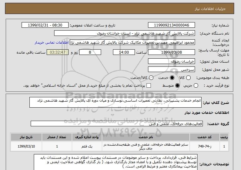 شرح کلی نیاز: انجام خدمات پشتیبانی، نظارتی تعمیرات اساسی،نوسازی و میان دوره ای پالایش گاز شهید هاشمی نژاد