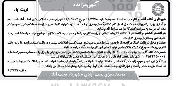 شهرداری نجف آباد در نظر دارد نسبت به واگذاری بهره برداری از خدمات حق العمل دام کشتارگاه شهرداری نجف آباد، با قیمت پایه کارشناسی ، طبق مشخصات و شرایط موجود در مدارک مزایده به شرکت کنندگان واجد شرایط اقدام نماید.