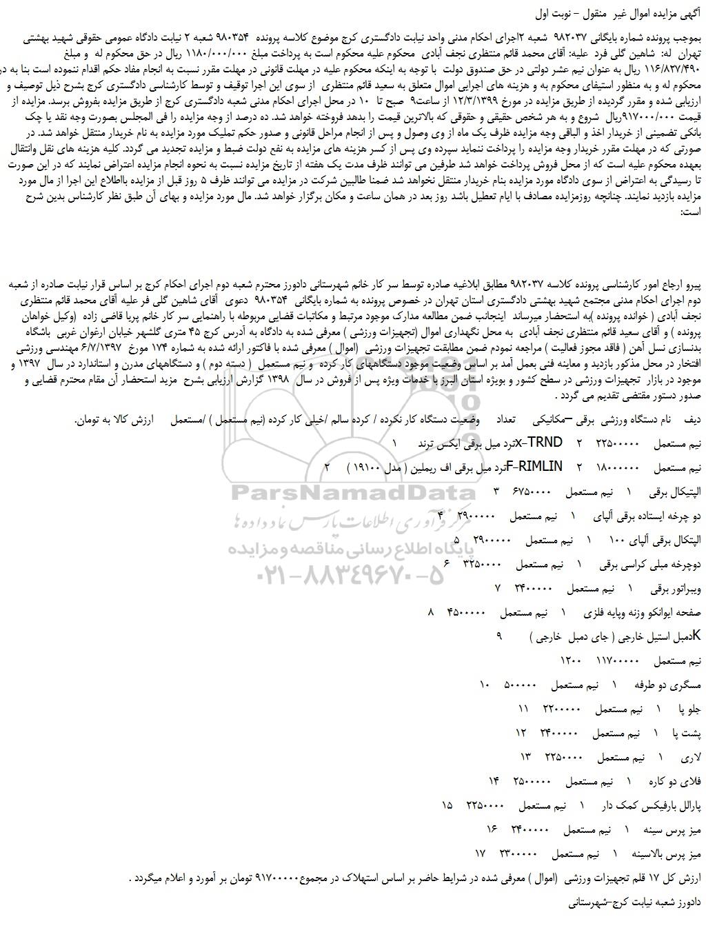 بموجب پرونده شماره بایگانی 982037 شعبه 2اجرای احکام مدنی واحد نیابت دادگستری کرج موضوع کلاسه پرونده 980354 شعبه 2 نیابت دادگاه عمومی حقوقی شهید بهشتی تهران له: شاهین گلی فرد علیه: آقای محمد قائم منتظری نجف آبادی محکوم علیه محکوم است به پرداخت مبلغ 1180/000/000 ریال در حق محکوم له و مبلغ 116/827/490 ریال به عنوان نیم عشر دولتی در حق صندوق دولت با توجه به اینکه محکوم علیه در مهلت قانونی در مهلت مقرر نسبت به انجام مفاد حکم اقدام ننموده است بنا به درخواست محکوم له و به منظور استیفای محکوم به و هزینه های اجرایی اموال متعلق به سعید قائم منتظری از سوی این اجرا توقیف و توسط کارشناسی دادگستری کرج بشرح ذیل توصیف و ارزیابی شده و مقرر گردیده از طریق مزایده در مورخ 12/3/1399 از ساعت9 صبح تا 10 در محل اجرای احکام مدنی شعبه دادگستری کرج از طریق مزایده بفروش برسد. مزایده از قیمت 917000/000ریال شروع و به هر شخص حقیقی و حقوقی که بالاترین قیمت را بدهد فروخته خواهد شد. ده درصد از وجه مزایده را فی المجلس بصورت وجه نقد یا چک بانکی تضمینی از خریدار اخذ و الباقی وجه مزایده ظرف یک ماه از وی وصول و پس از انجام مراحل قانونی و صدور حکم تملیک مورد مزایده به نام خریدار منتقل خواهد شد. در صورتی که در مهلت مقرر خریدار وجه مزایده را پرداخت ننماید سپرده وی پس از کسر هزینه های مزایده به نفع دولت ضبط و مزایده تجدید می گردد. کلیه هزینه های نقل وانتقال بعهده محکوم علیه است که از محل فروش پرداخت خواهد شد طرفین می توانند ظرف مدت یک هفته از تاریخ مزایده نسبت به نحوه انجام مزایده اعتراض نمایند که در این صورت تا رسیدگی به اعتراض از سوی دادگاه مورد مزایده بنام خریدار منتقل نخواهد شد ضمنا طالبین شرکت در مزایده می توانند ظرف 5 روز قبل از مزایده بااطلاع این اجرا از مال مورد مزایده بازدید نمایند. چنانچه روزمزایده مصادف با ایام تعطیل باشد روز بعد در همان ساعت و مکان برگزار خواهد شد. مال مورد مزایده و بهای آن طبق نظر کارشناس بدین شرح است: