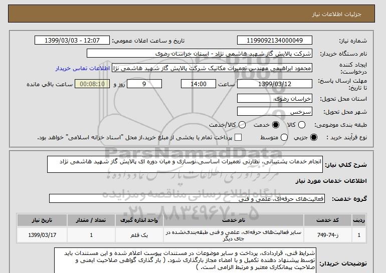 شرح کلی نیاز: انجام خدمات پشتیبانی، نظارتی تعمیرات اساسی،نوسازی و میان دوره ای پالایش گاز شهید هاشمی نژاد