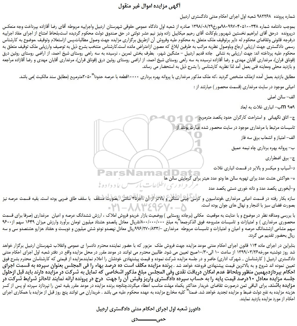 بموجب دادنامه شماره 9809970405100348مورخ1398/08/29 صادره از شعبه اول دادگاه عمومی حقوقی شهرستان اردبیل واجراییه مربوطه آقای رضا آقازاده بپرداخت وجه منعکس درپرونده درحق آقای ابراهیم نخستین شهریور باوکالت آقای رحیم میکاییل زاده ونیز نیم عشر دولتی در حق صندوق دولت محکوم گردیده است،بلحاظ امتناع از اجرای مفاد اجراییه درفرجه قانونی وتقاضای محکوم له دایر برتوقیف ملک متعلق به محکوم علیه وفروش آن ازطریق برگزاری مزایده جهت وصول مطالبات،پس ازاستعلام وتوقیف ،موضوع به کارشناس رسمی دادگستری جهت ارزیابی ارجاع وباوصول نظریه مراتب به طرفین ابلاغ که مصون ازاعتراض مانده است.کارشناس منتخب بشرح ذیل به توصیف وارزیابی ملک توقیف متعلق به محکوم علیه پرداخته اند: جهت ارزیابی به نشانی جاده قدیم اردبیل - مشگین شهر، بطرف بخش ثمرین ، نرسیده به سه راهی روستای شیخ احمد، از اراضی روستای روئین درق (قوناق قران)، مرغداری آقایان مهدی و رضا آقازاده نرسیده به سه راهی روستای شیخ احمد، از اراضی روستای روئین درق (قوناق قران)، مرغداری آقایان مهدی و رضا آقازاده مراجعه و بازدید محلی ومعاینه فنی بعمل آمد لذا نظریه کارشناسی را بشرح ذیل به استحضار می رساند.