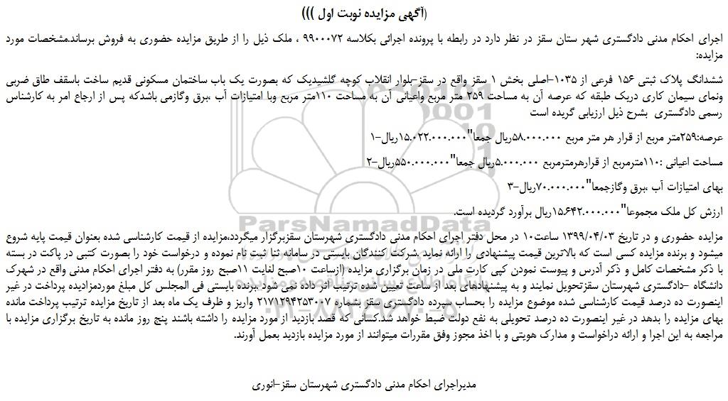 ششدانگ پلاک ثبتی 156 فرعی از 1035-اصلی بخش 1 سقز واقع در سقز-بلوار انقلاب کوچه گلشیدیک که بصورت یک باب ساختمان مسکونی قدیم ساخت باسقف طاق ضربی ونمای سیمان کاری دریک طبقه که عرصه آن به مساحت 259 متر مربع واعیانی آن به مساحت 110متر مربع وبا امتیازات آب ،برق وگازمی باشدکه پس از ارجاع امر به کارشناس رسمی دادگستری بشرح ذیل ارزیابی گریده است