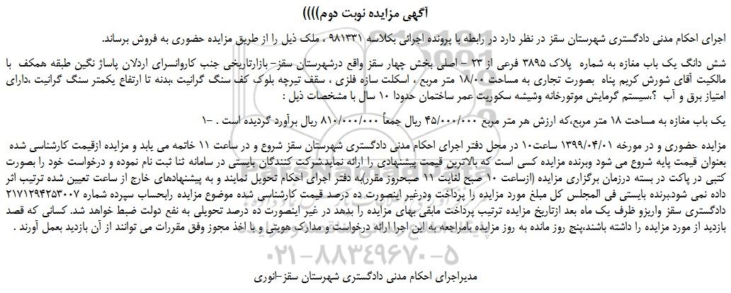 اجرای احکام مدنی دادگستری شهرستان سقز در نظر دارد در رابطه با پرونده اجرائی بکلاسه 981331 ، ملک ذیل را از طریق مزایده حضوری به فروش برساند.
