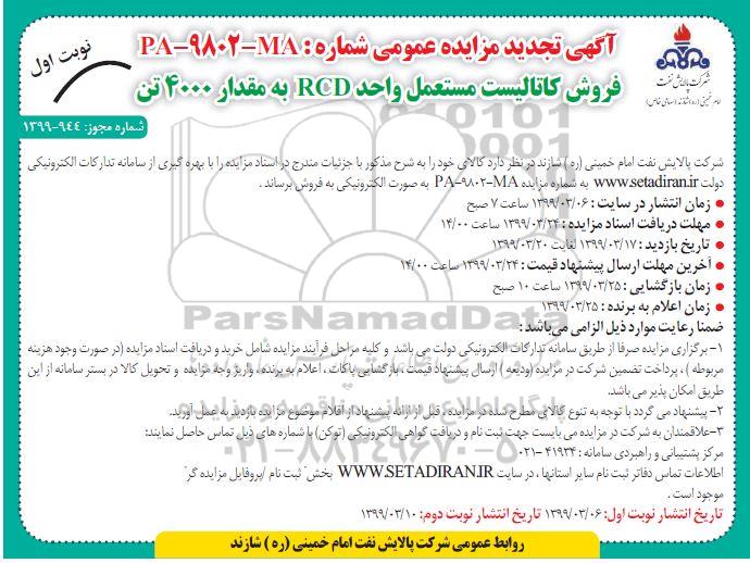 شرکت پالایش نفت امام خمینی (ره) شازند در نظر دارد کالای خود را به شرح مذکور با جزئیات مندرج در اسناد مزایده را با بهره گیری از سامانه تدارکات الکترونیکی دولت با شماره مزایده PA-9802-MA شماره سیستمی ... به صورت الکترونیکی به فروش برساند.