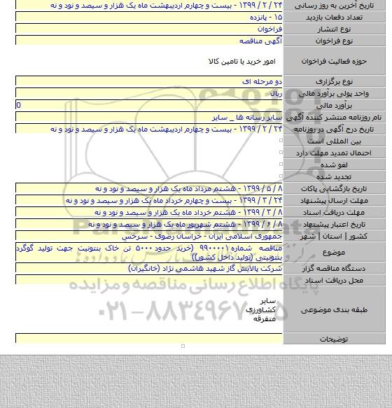 مناقصه, مناقصه شماره ۹۹۰۰۰۰۱ (خرید حدود ۵۰۰۰ تن خاک بنتونیت جهت تولید گوگرد بنتونیتی (تولید داخل کشور)), مناقصه شماره ۹۹۰۰۰۰۱ (خرید حدود ۵۰۰۰ تن خاک بنتونیت جهت تولید گوگرد بنتونیتی (تولید داخل کشور))