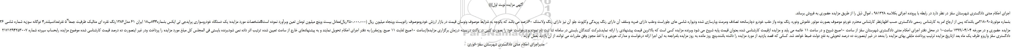 مشخصات مورد مزایده: یک دستگاه خودروسواری پرایدجی تی ایکس بشماره844ب18 ایران 61 مدل1386رنگ نقره ای متالیک ظرفیت جمعا"5 نفرتعدادسیلندر4 دوگانه سوزبه شماره شاسی 1412286632736sبشماره موتور2180905می باشدکه پس از ارجاع امر به کارشناس رسمی دادگستری حسب اظهارنظر کارشناس محترم خوردو موصوف بصورت موتور خاموش ودوره رنگ بوده واز عقب خودرو دچارسانحه تصادف ومرمت وبارسازی شده ودیواره شاسی های جلوراست وعقب دارای ضربه وسقف آن دارای رنگ پریدگی وکاپوت جلو آن نیز دارای رنگ ولاستک 60درصد می باشد که باتوجه به شرایط موصوف ونوسان قیمت در بازار ارزش خودروموصوف رادویست وپنجاه میلیون ریال (250.000.000ریال)معادل بیست وپنج میلیون تومان تعین وبرآورد نموده است