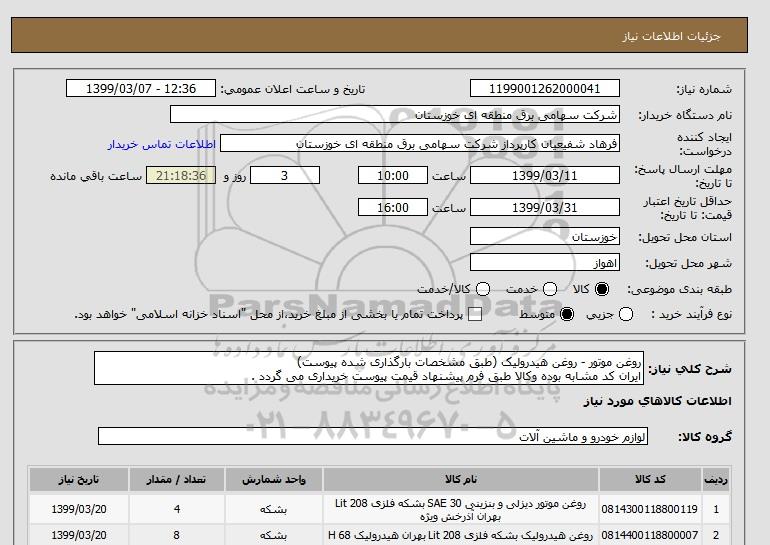 شرح کلی نیاز: روغن موتور - روغن هیدرولیک (طبق مشخصات بارگذاری شده پیوست)