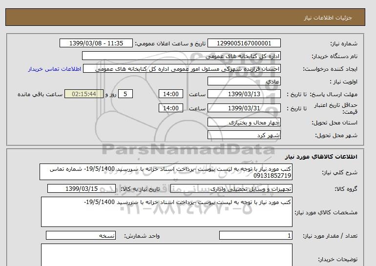 مشخصات کالای مورد نیاز: کتب مورد نیاز با توجه به لیست پیوست -پرداخت اسناد خزانه با سررسید 19/5/1400-