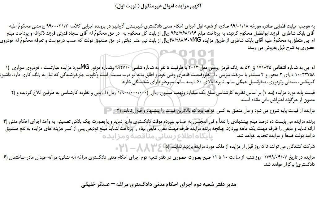 به موجب  نیابت قضایی صادره مورخه 99/01/18 صادره از شعبه اول اجرای احکام مدنی دادگستری شهرستان آذرشهر در پرونده اجرایی کلاسه 9900031/2 ج مدنی محکومٌ علیه آقای بابک شاطری  فرزند ابوالفضل محکوم گردیده به پرداخت مبلغ 965/768/194 ریال از بابت کل محکوم به  در حق محکومٌ له آقای سجاد قدرتی فرزند ذکرالله و پرداخت مبلغ 48/288/409ریال از بابت نیم عشر دولتی در حق صندوق دولت که حسب درخواست و تعرفه محکومٌ له خودروی سواری MG ام جی متعلق به محکومٌ علیه آقای بابک شاطری از طریق مزایده حضوری به شرح ذیل بفروش می رسد: